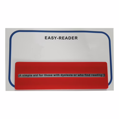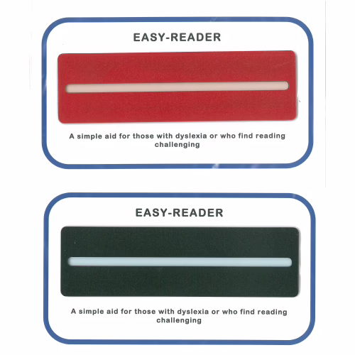 EASY-READER is a plastic strip 17cm x 5cm with a tinted window 160mm x 6mm which can be placed over a line of text to enable the reader to focus on the words without the distraction of the rest of the page. EASY-READER is matt black on one side and matt red on the other.